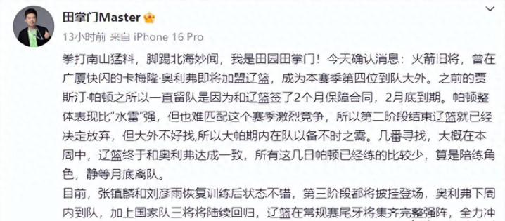 辽篮即将迎完整阵容! 奥利弗取代帕顿, 王牌锋线第三阶段满血归来